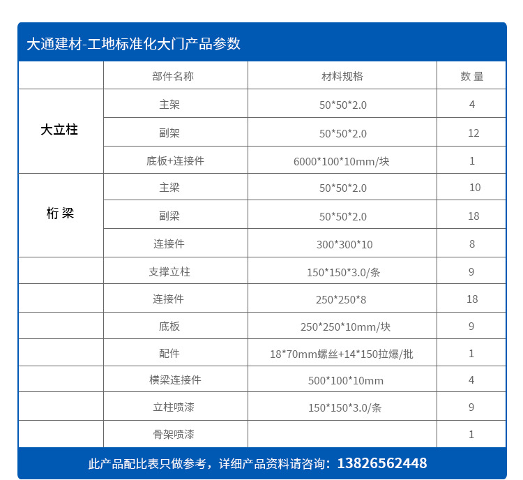 深圳市大通建材有限公司生產(chǎn)批發(fā)的施工現(xiàn)場標(biāo)準(zhǔn)工地大門,符合市政標(biāo)準(zhǔn)、美觀環(huán)保、安全穩(wěn)固,大通建材建筑工地大門常規(guī)尺寸有現(xiàn)貨,亦可按實(shí)際需求定制生產(chǎn)。了解更多關(guān)于 標(biāo)準(zhǔn)工地大門 規(guī)格、價(jià)格等詳情請(qǐng)致電 梁先生13826562448 感謝您的信賴與支持 期待與您的合作!