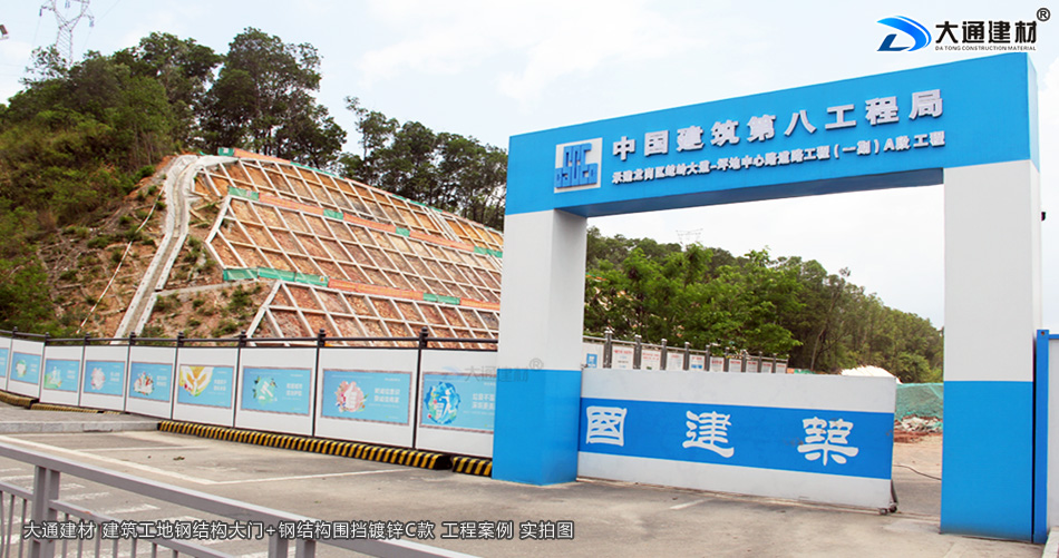 一般來說建筑工地大門是施工企業(yè)向社會大眾展示的企業(yè)形象,體現(xiàn)了企業(yè)的風(fēng)貌。中國建筑八局集團在深圳市龍崗區(qū)蛇嶺大道坪地中心路道路工程(一期)A段的工程項目,選用了深圳市大通建材生產(chǎn)的鋼結(jié)構(gòu)工地大門為項目部大門。