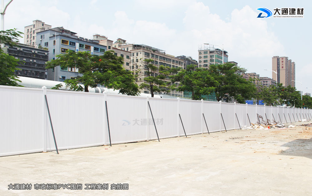 上述介紹的這款大通建材市政標(biāo)準(zhǔn)PVC圍擋的圍墻板采用白色PVC長條版拼接,而立柱、橫管均為白色PVC材料,內(nèi)部均襯塑鋼方通,立柱底板為鋼板,機(jī)動靈活,快速拆裝,簡單快捷牢固,經(jīng)濟(jì)實用、成本低; 并加斜支撐,增加受力,承載力大、抗風(fēng)阻系數(shù)高、穩(wěn)定性強(qiáng)。非常適用于市政建設(shè)施工、房地產(chǎn)項目施工、高架橋施工、地地鐵項目施工、路橋維護(hù)施工、隧道施工、立面改造施工、廠房隔斷施工等工程。