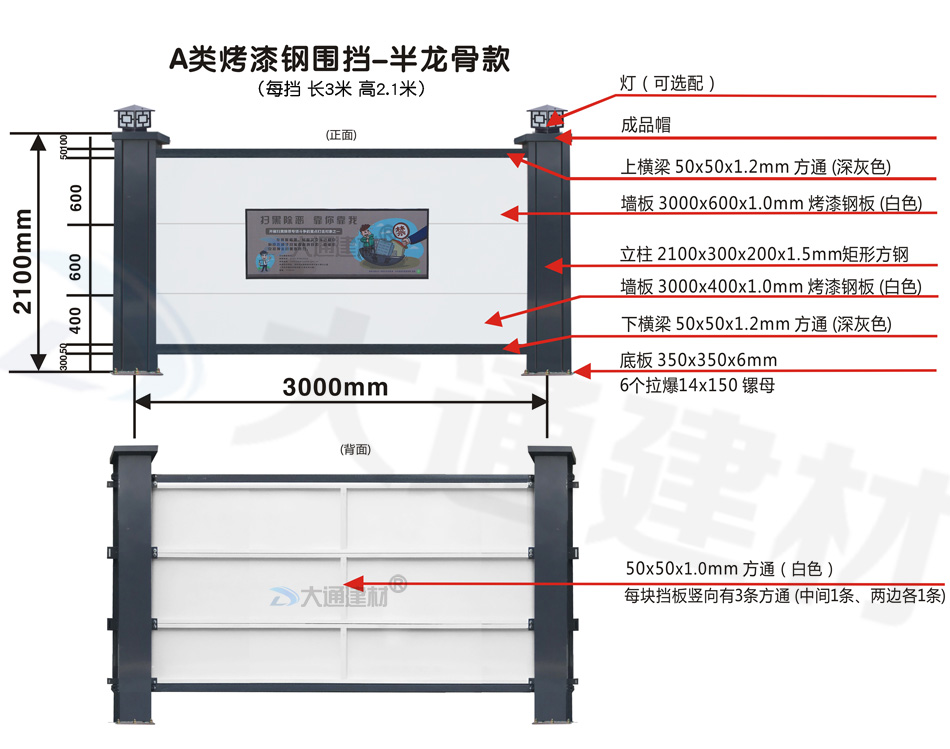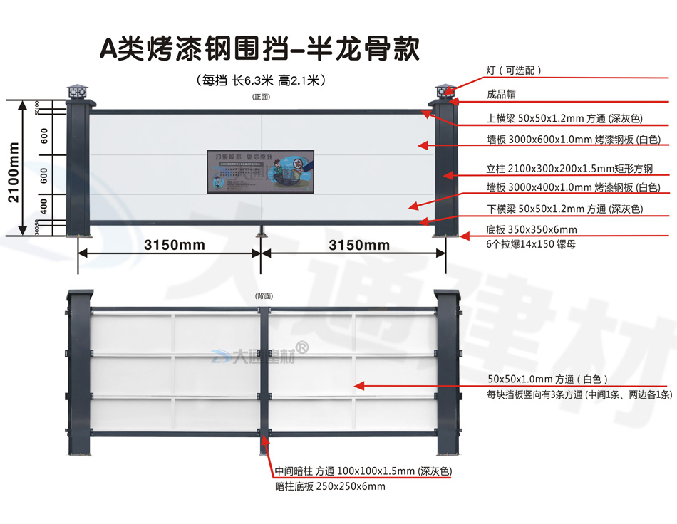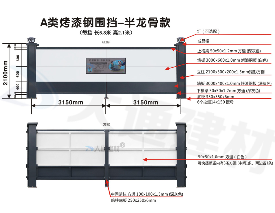深圳市大通建材A類鋼圍擋烤漆半龍骨款的標(biāo)準高度是2.5米、長度為6.3米一擋,而圍擋高度特殊需求的如2.1米/3米/4米/5米/6米等高度的可以進行定制化生產(chǎn)。