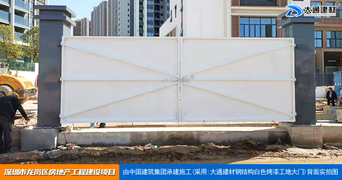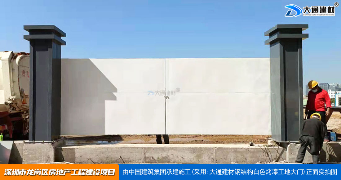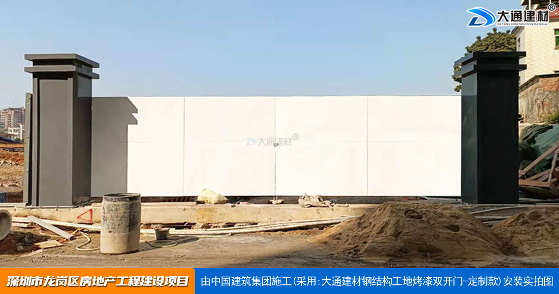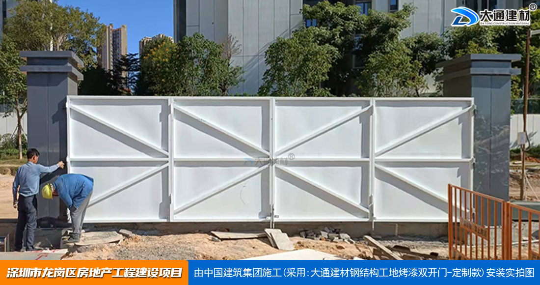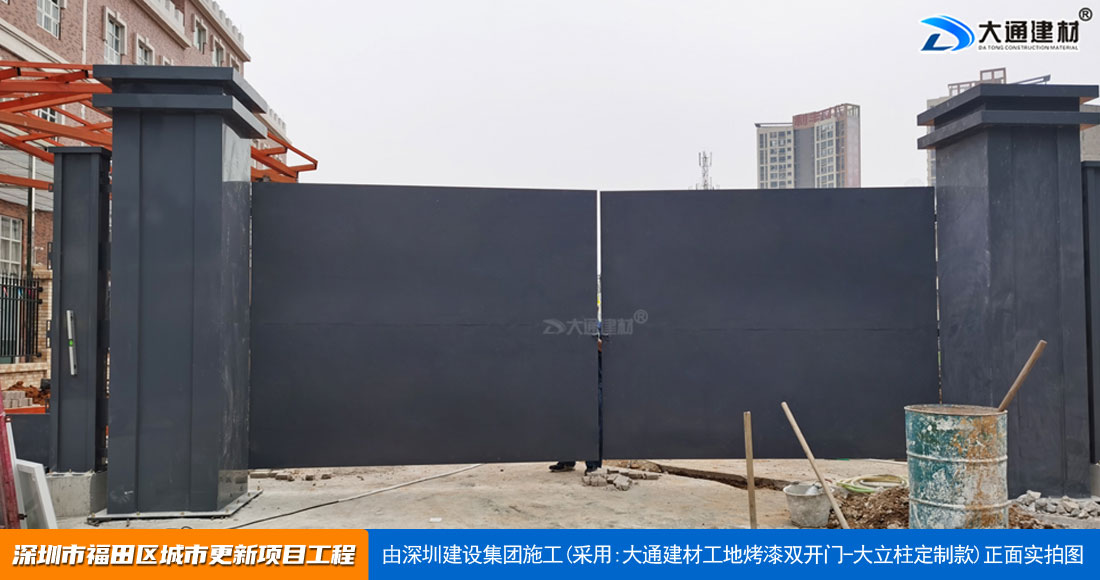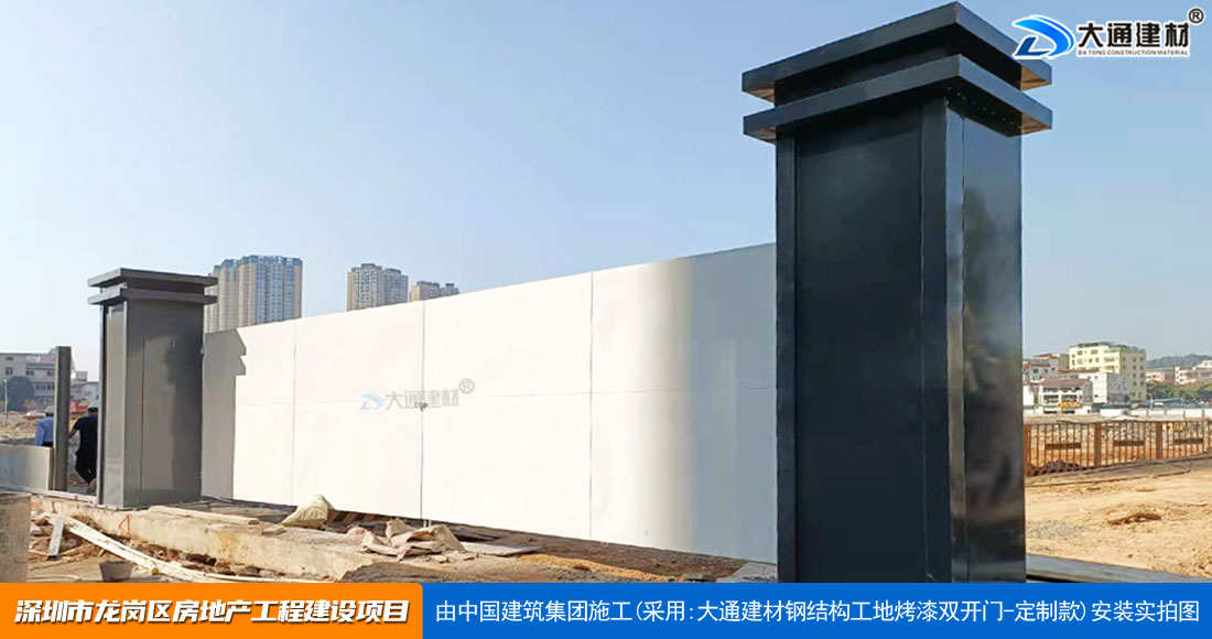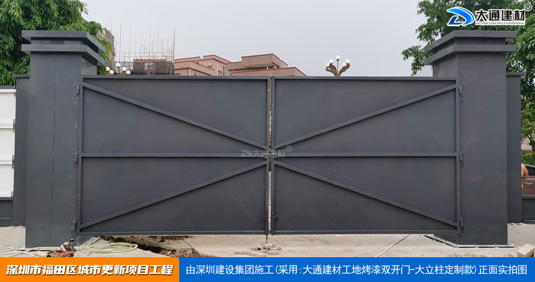 深圳大通建材生產銷售的工地烤漆雙開門-鋼結構工地大門適用于各種市政工程項目、房地產項目、地鐵修建項目施工、管網改造、小區(qū)改造、城市建設、道路修建等工程項目使用