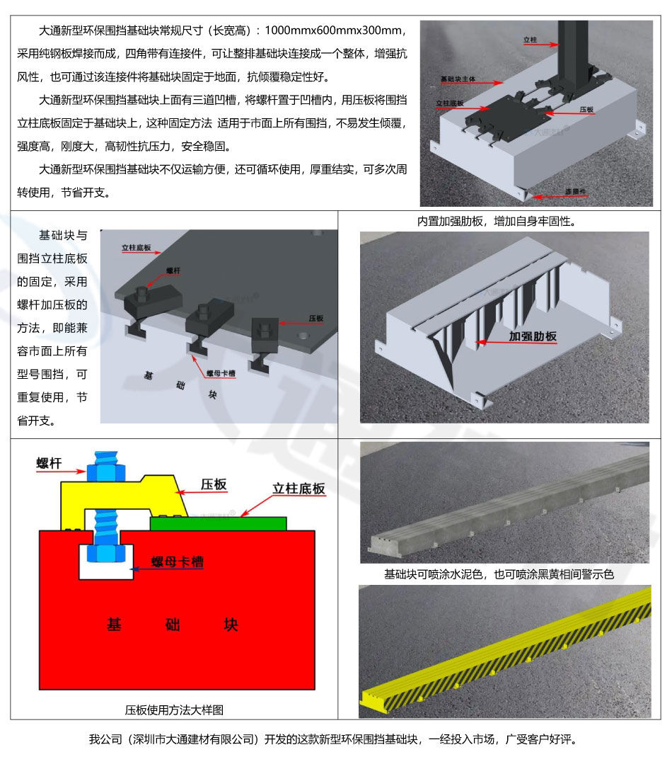 深圳市大通建材有限公司是一家專業(yè)的新型環(huán)保圍擋基礎(chǔ)、圍擋基礎(chǔ)水泥預(yù)制塊、圍擋水泥墩、圍擋基座生產(chǎn)批發(fā)廠家,了解更多“大通建材圍擋基礎(chǔ)”規(guī)格與價格詳情 請致電 梁先生13826562448
